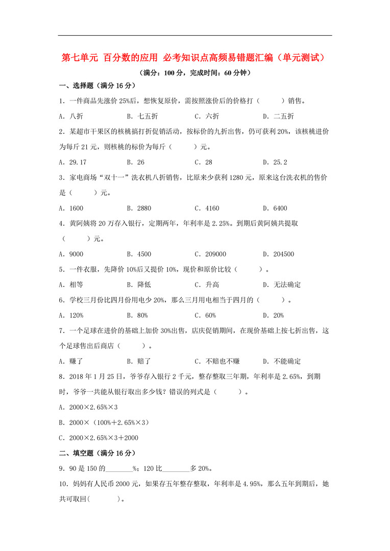 小学数学六年级上册(北师大版)第七单元+百分数的应用+必考知识点高频易错题汇编(单元测试)