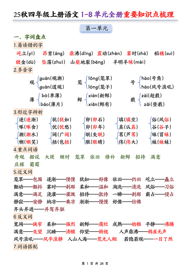 25秋四上语文1-8单元全册重要知识点梳理(24页)